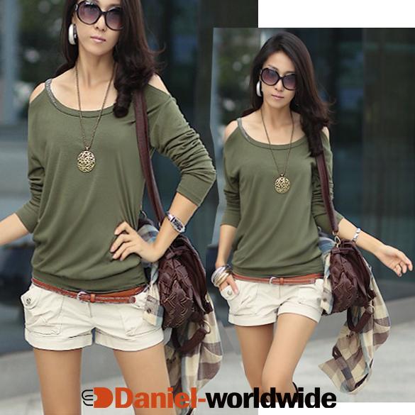 Hot Fashion Women's Lady Cotton Blends Long Sleeve Sexy Shoulder T-Shirt Top Blouse 4 Colors