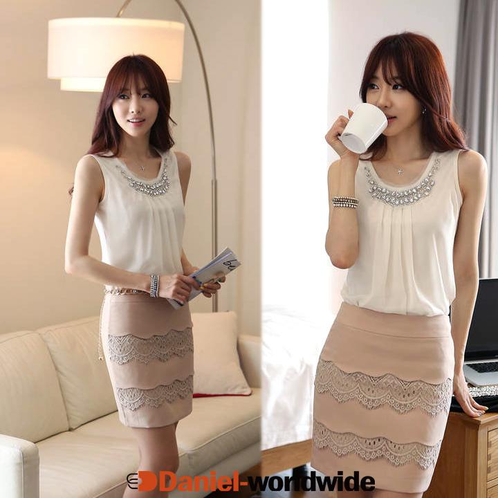 Europe Women's Fashion Round Neck Beaded Rhinestone Embellished Sleeveless Shirt Tops Blouse