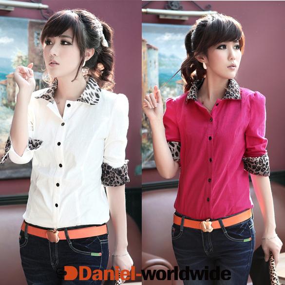 Korean Women's Leopard Decoration Long Sleeve Corduroy Shirt Blouse 2 Colors