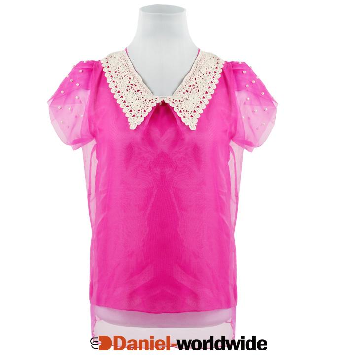 Women Double Layer Organza Chiffon Beaded Hook T-shirt Tops