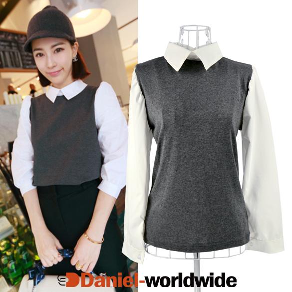 Women's Faux Twinset Princess Sleeve Color Block Shirt Blouse