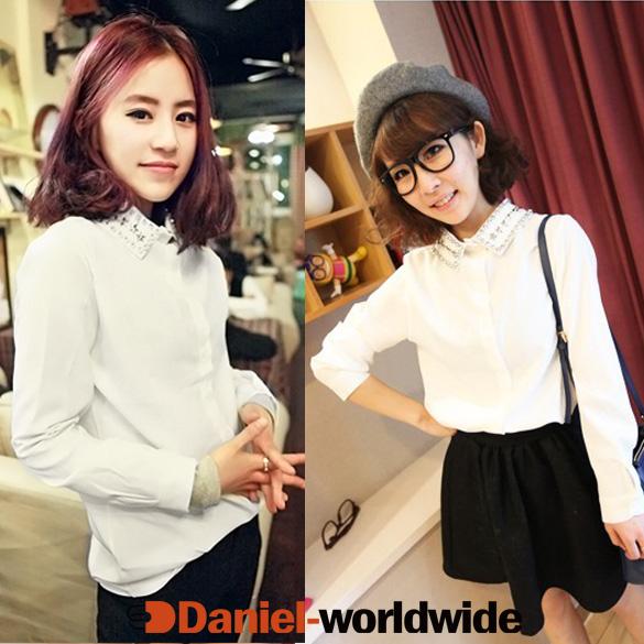 Women's Bright Rhinestone Turndown Collar Chiffon Shirt Top Blouse