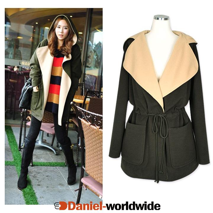 Female Casual Thick Hooded Splicing Color Lace-up Long Coat