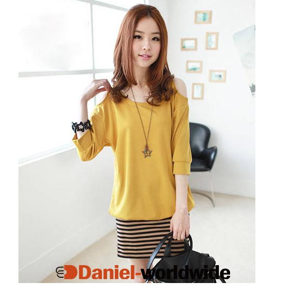 > Women Hollow Shoulder Batwing Loose Stripe Fake Tw..