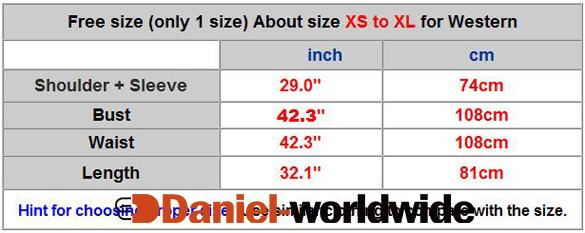 | Free size (only 1 size) About size XS to XL for Western | | | inch | cm | | Shoulder + Sleeve | 29.0" | 74cm | | Bust | 42.3" | 108cm | | Waist | 42.3" | 108cm | | Length | 32.1" | 81cm | | Hint for choosing proper size: Use similar clothing to compare with the size. |