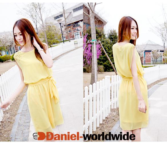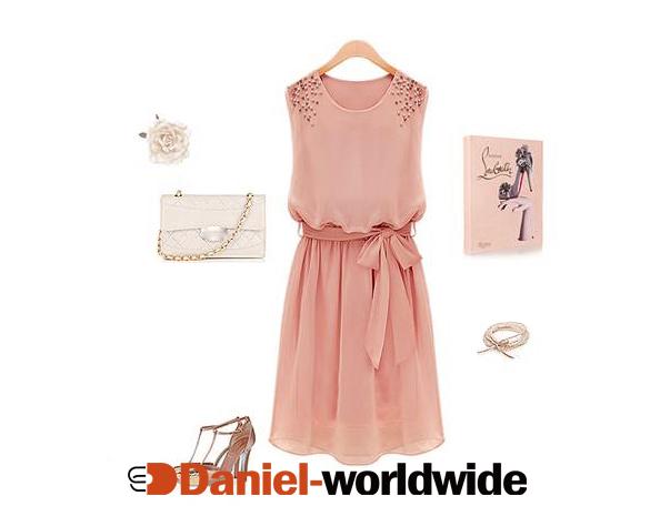 Ladies Summer Handmade Bead Shoulder Chiffon Dress Bow Belt Sleeveless Pleated