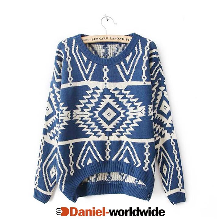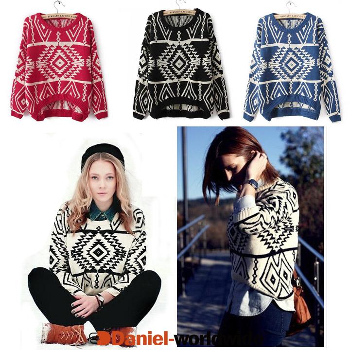 Women Loose Sweater Geometry Design Printed Long Sleeve Pullovers Big Size