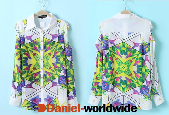 Ladies Elegant Chiffon Printing Hollow Shoulder Long Sleeve Blouse