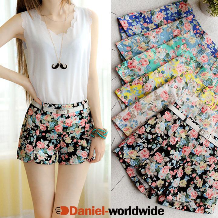 Flower Pattern Floral Elastic High Waist Women Pants Mini Trouser