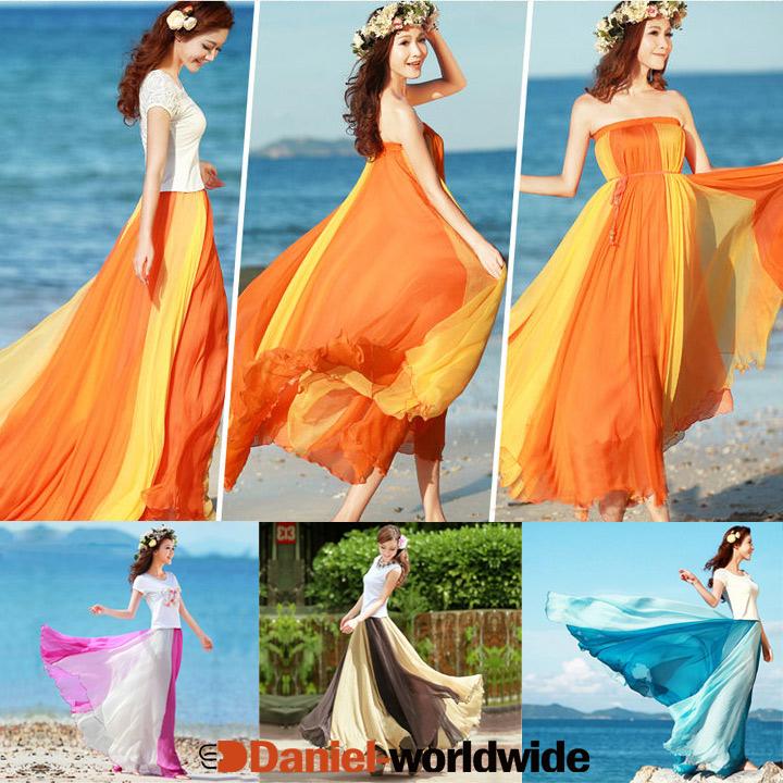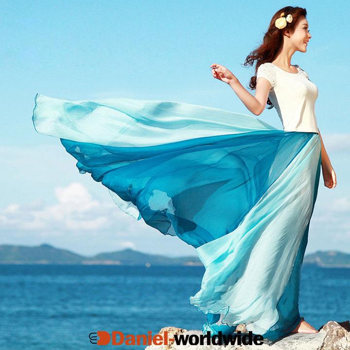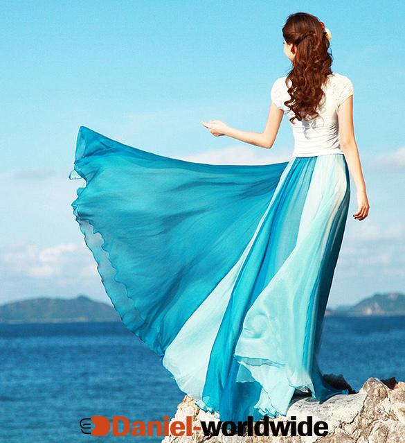 Vintage Style Women Soft Chiffon Contrast Elastic Waist Maxi Full Boho Skirt