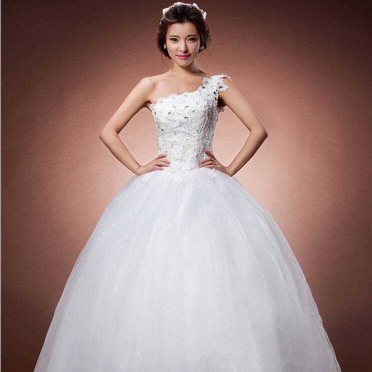 2015 latest one shoulder's lace prettiest flower petal wedding dress