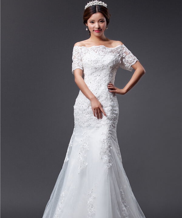 2015 new high-end flat shoulder floor length court train mermaid wedding dress