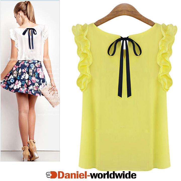 Women's O-neck Lotus Leaf Pullover Lacing Bow Chiffon Shirt Top Blouse