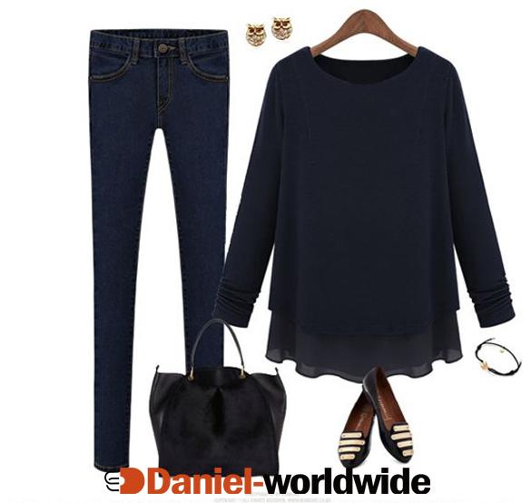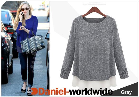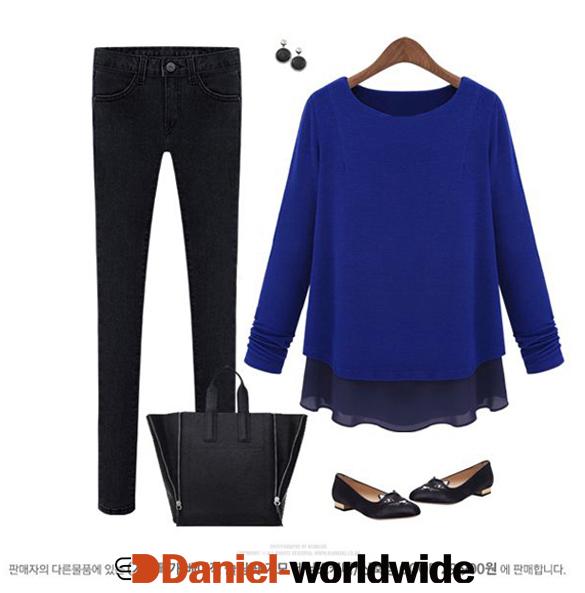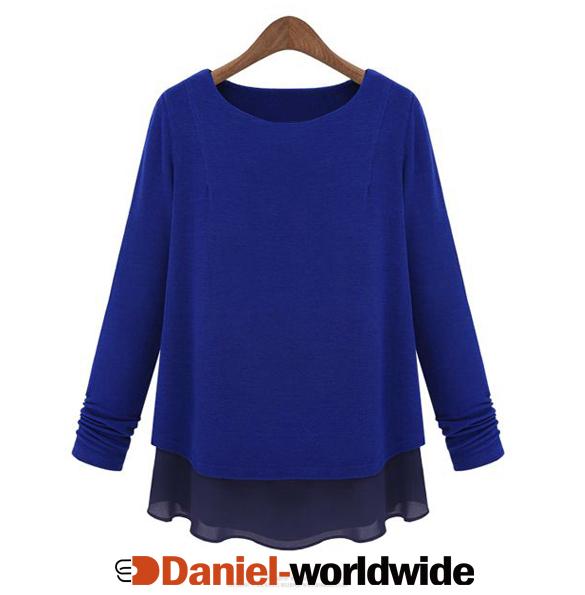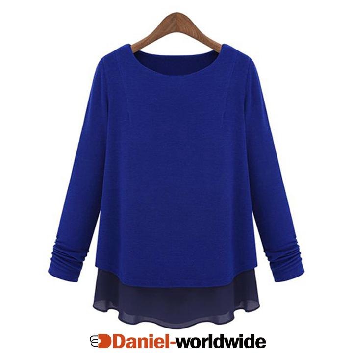 Women Contrast Long Sleeve Two Layer Tiered Knit with Chiffon Top Blouse