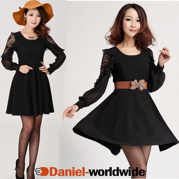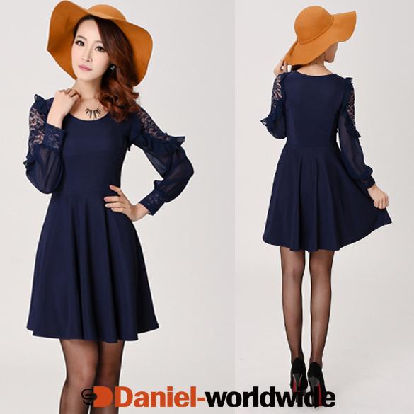Elegant Ladies Lace Hollow Out Long Sleeve Round Neck Women's Princess Dress With Waistband