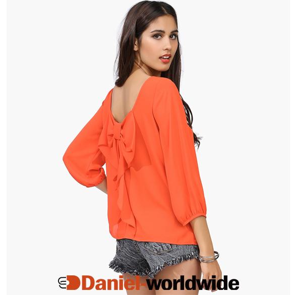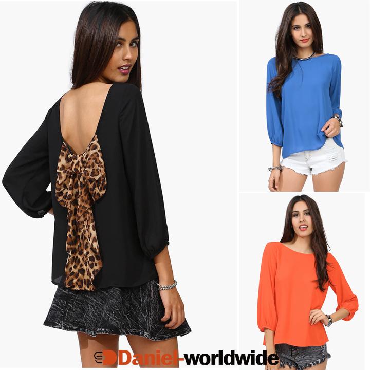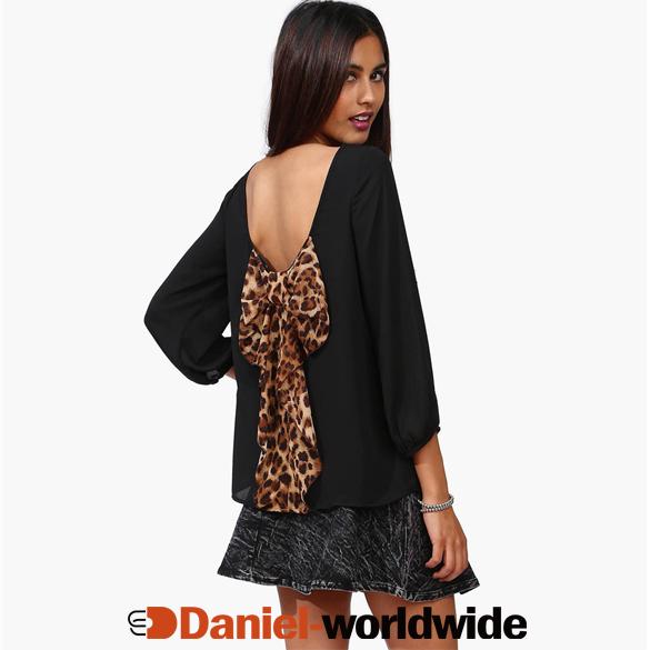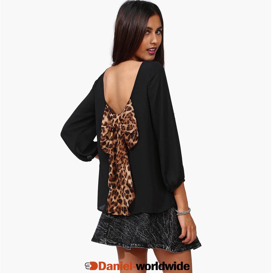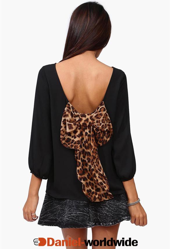 Women Cut Out Back Evening Top T-Shirts Vests Blouse With Leopard Bow Tie