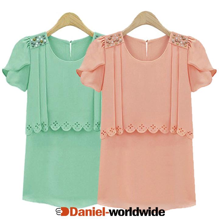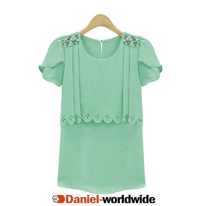 Women's Tulip Sleeve Manual Beaded Crew Neck Loose Chiffon Blouse
