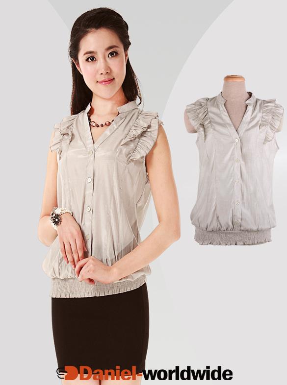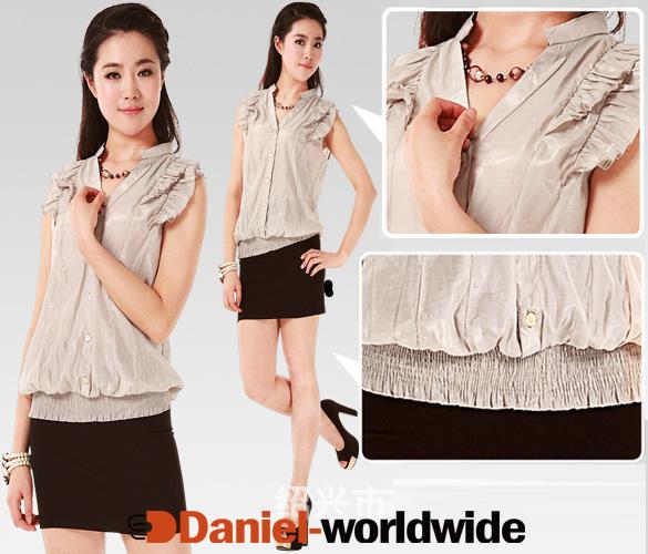Lady Nude Color Flouncing V-neck Stand Collar Sleeveless Shirt Top Blouse