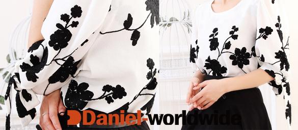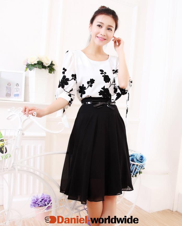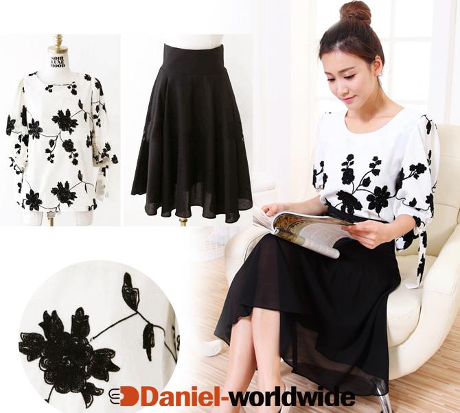 1 Set Linen 1/2 Sleeve Embroidered Flowers Top + Black Skirt Chiffon Twinset