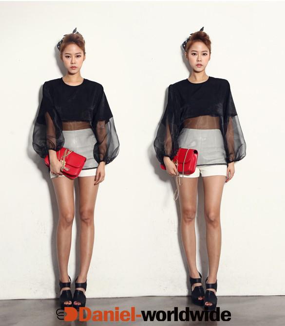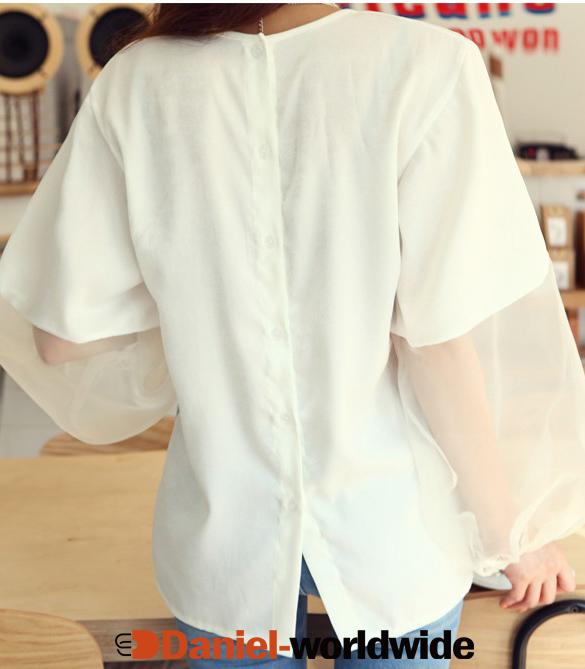 2014 New Charming Organza Satin Splicing Sexy See-through Lantern Sleeve Shirt Hollow Tops Blouse