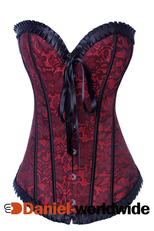 This strapless Red Lace Burlesque Overbust Corset with front busk closure, lace-up back for cinching and matching g-string.