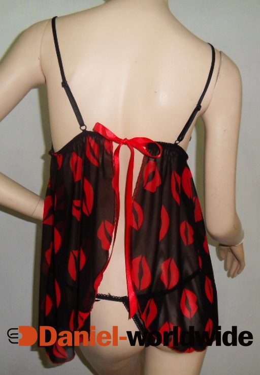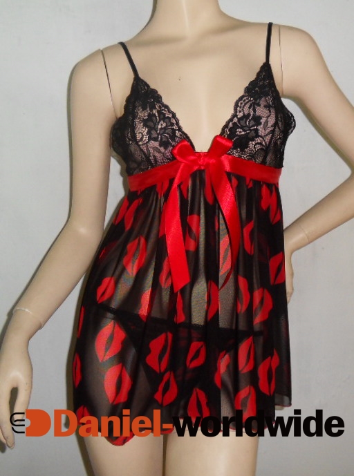 Red Lips Pattern With Lace Bra Babydoll open of the back and ribbon in the back. Have a Black satin Bow on the front! Matching g-string.