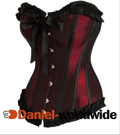 Red taffeta overbust corset with matching g-string. And stainless steel busk closure on front, This beautiful corset is completed with a black taffeta trim.
