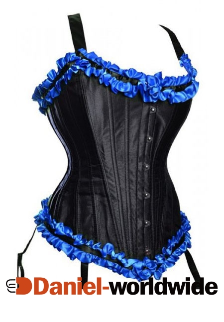This Sexy Tie Strap Burlesque Corset with blue ruffle trim,an black ribbon tie straps, front busk closure, laces up the back and matching g-string. Not including the black stocking!