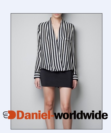 >   Product   >   Blouses   >   Stripe V-Neck Long Sleeve Blouse Black &White