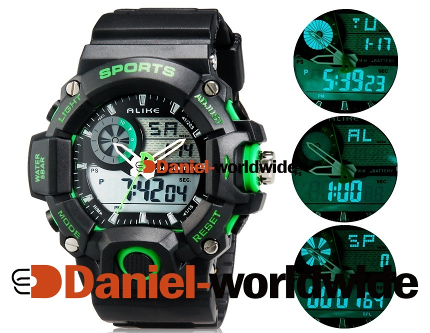 AR14101 Unisex 50M Water Resistant Quartz & Electronic Dual Movement Sport Watch with Calendar & Alarm Clock Function (Green)