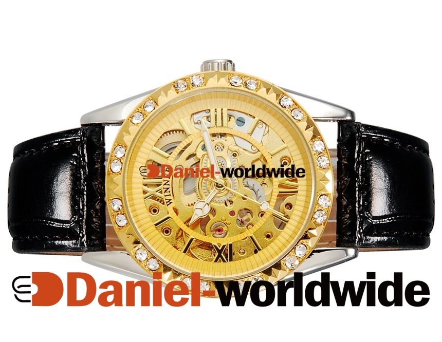 Winner Women's Stunning Crystal Rhinestone Decorated Automatic Mechanical Wrist Watch with Roman Numerals & Faux Leather Band (Golden)