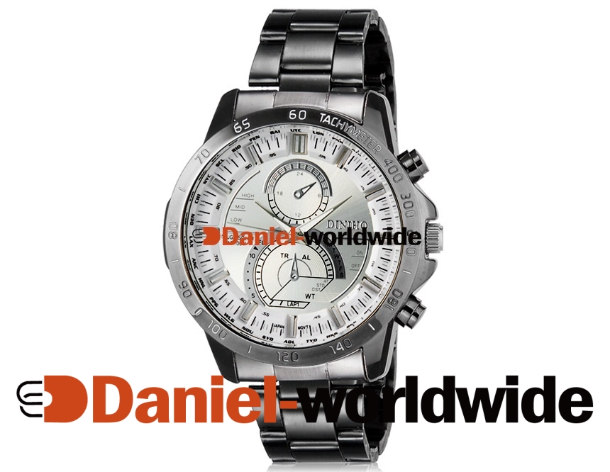 DINIHO 8012G Solar Powered 100M Water Resistant Men's Analog Sports Wrist Watch with Stainless Steel Band (White)