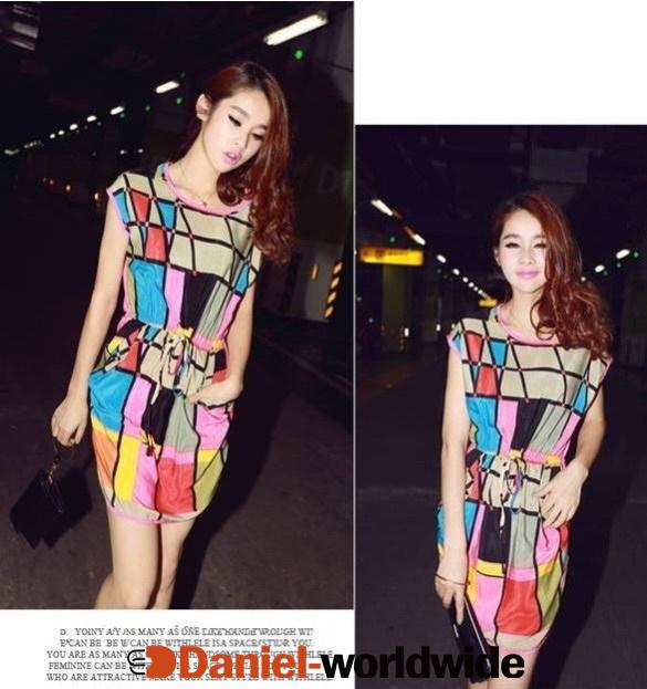 Women's Summer Colorful Grid Crew Neck Waist Tie Vest Skirt Chiffon Dress