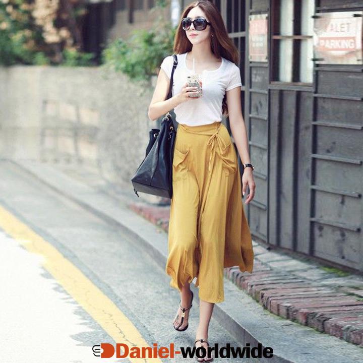 Korea Women Irregular Loose Chiffon Long Beach Skirt Yellow