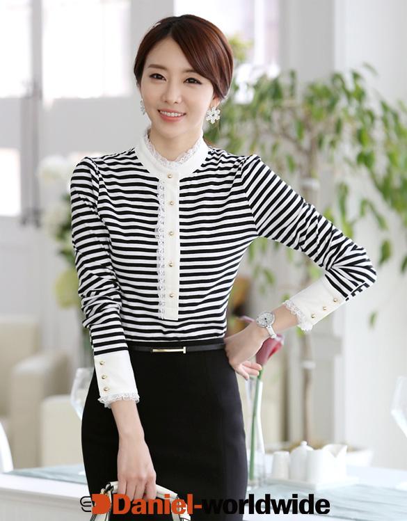 Women OL Lace Stripe Long Sleeve Stand Collar Blouse Shirt Tops