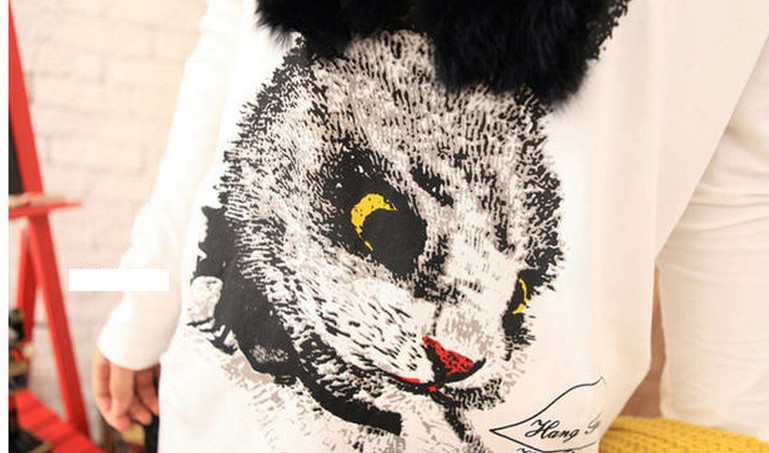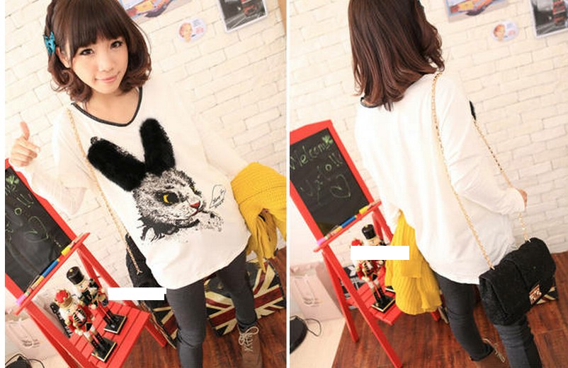 Cool PU Round Collar Cony Hair Embellished Rabbit Pattern Tee White