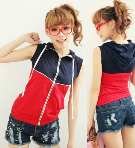Casual Color Block Hooded Zipper Sleeveless T-shirt Red