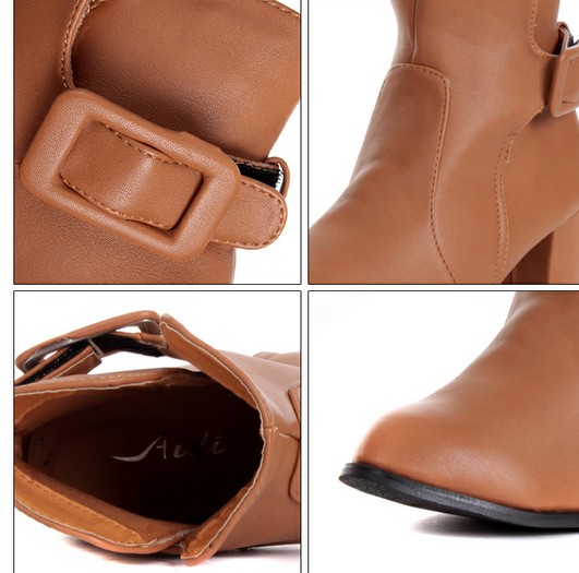 Mix-matched Pure Colour Belt Fastener Embellished Low-heeled Boot Brown