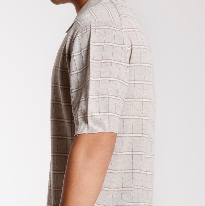 Casual Style Color Matching Check Stripe Lapel T-Shirt Grey